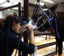 Hoe ziet een behandeling eruit?De behandeling start met een kennismaking met het paard. Daarna vindt een algemene inspectie van het paard en in het bijzonder van het hoofd plaats. Hierbij wordt gevoeld of de kauwspieren goed ontwikkeld zijn en het kaakgewricht normaal aanvoelt. Er wordt gekeken of het paard neusuitvloeiing heeft en de lymfeklieren worden gevoeld. Op deze manier werk ik steeds verder richting de mond en heeft het paard de tijd om even aan mij te wennen. Na deze algemene inspectie zal een speculum (mondsperder) bij het paard omgedaan worden. De behandeling start met het elektrisch wegvijlen van de glazuurpunten. Dit zijn scherpe uiteinden aan de zijkant van de kiezen die verwondingen aan het wangslijmvlies en de tong kunnen veroorzaken. Eventuele haken worden weggevijld en richels op de kauwvlakken worden weggehaald. Als er wolfstanden aanwezig zijn worden deze verwijderd. Op de voorste kiezen zullen bitseats gemaakt worden. Dit zijn lichte afrondingen van de voorste kiezen om het aangenamer te maken voor het paard wanneer deze een bit in heeft. Wat er verder behandeld wordt aan het gebit is afhankelijk van de staat waarin het gebit verkeert.Daarna worden de snijtanden behandeld. Of en hoeveel de snijtanden ingekort worden is afhankelijk van de ruimte die er tussen de kiezen zit. Uitgangspunt van het behandelen van de snijtanden is altijd om een goede sluiting van de kiezen te krijgen.Hierna zal de mondsperder uitgaan en ga ik het gebit (verder) in balans brengen. Hiervoor moet het paard juist de kiezen op elkaar houden. Dan pas kun je goed zien of alles naadloos op elkaar past en of de drukverdeling op alle kiezen gelijk is. Met kleine aanpassingen zorg ik ervoor dat de balans weer optimaal wordt. Dit is een essentieel onderdeel van de behandeling. Bij een ongelijke drukverdeling op de kiezen ontstaat spanning in het kaakgewricht en kunnen kiezen schade oplopen en zelfs los gaan zitten. Na het vijlwerk is dit dus nog een belangrijke stap! Ik vind het erg belangrijk om ook de eigenaar van het paard te betrekken bij de behandeling. Tijdens de behandeling zal ik dan ook zoveel mogelijk uitleg geven over wat er met het gebit aan de hand is, waarom het paard ergens last van heeft en wat ik er aan ga doen.